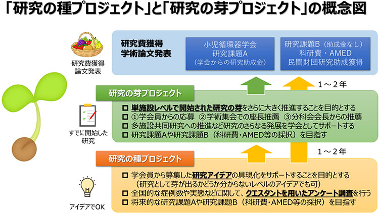 「研究の種プロジェクト」は、本学会会員が着想した研究のアイデアを募集し、学会のアンケートシステムを用いて、研究開始に当たっての症例数調査や参加希望施設調査などを実施することによって、具体的な研究計画の策定を支援し、研究課題AおよびB、競争的資金の獲得につながるような研究の発展を応援することを目的としています。研究課題は小児・成育循環器領域の研究とし、基礎研究、臨床研究の別は問いません。